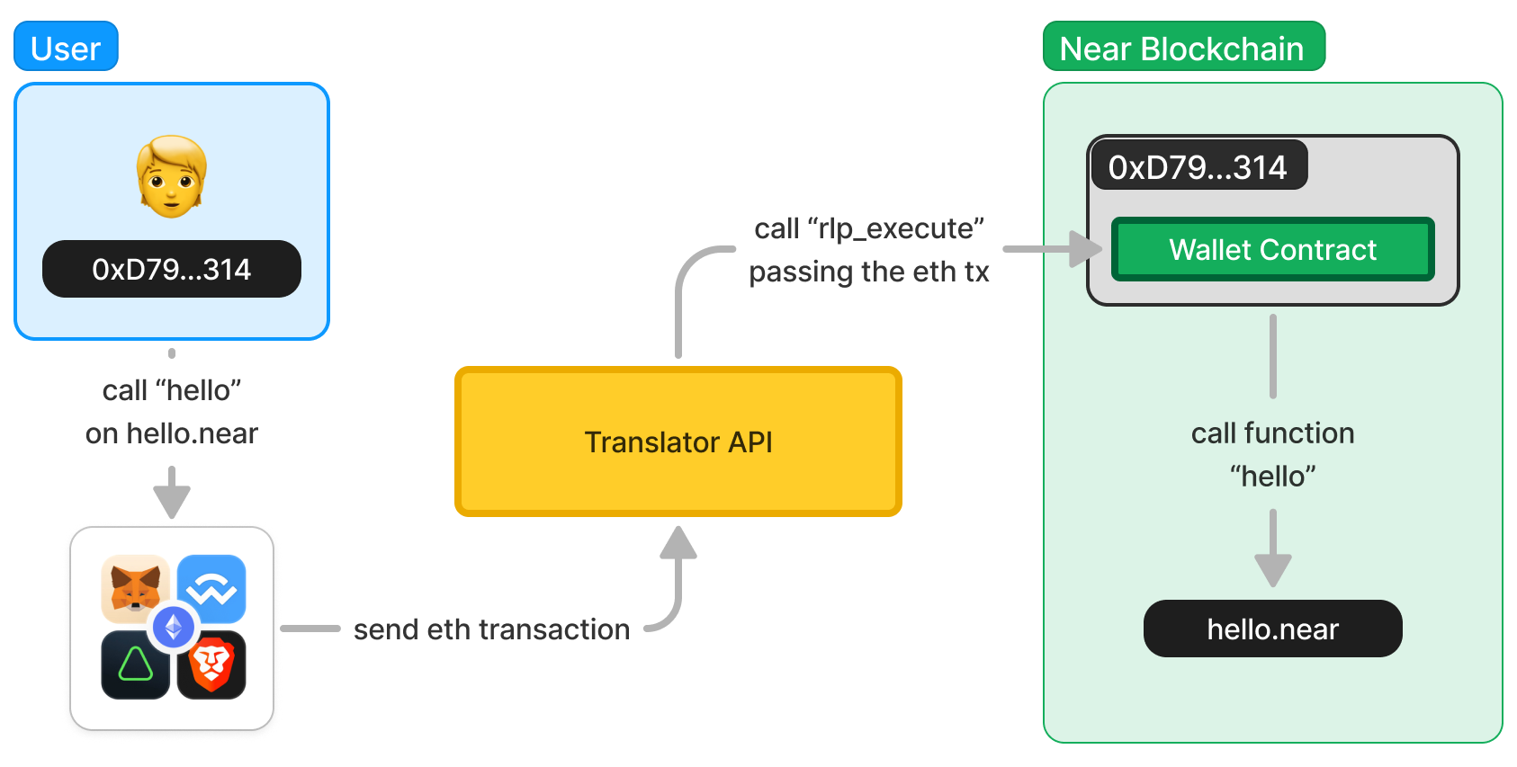 - A "Wallet Contract" deployed on Near, that can process Ethereum transactions