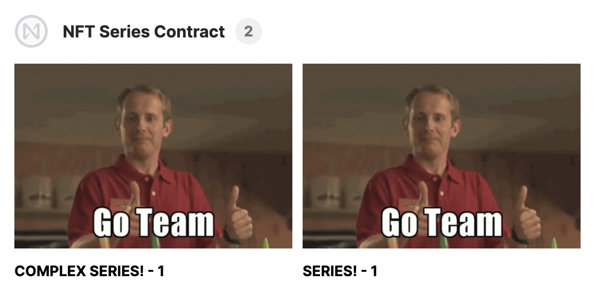 Now that you've received both NFTs, they should show up in the NEAR wallet. Open the collectibles tab and search for the contract with the title NFT Series Contract and you should own two NFTs. One should be the complex series and the other should just be the simple version. Both should have - 1 appended to the end of the title because the NFTs are the first editions for each series.